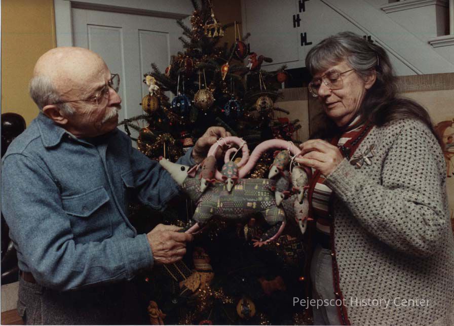 A color photographic view of a couple making a Christmas decoration that looks like an opossum.