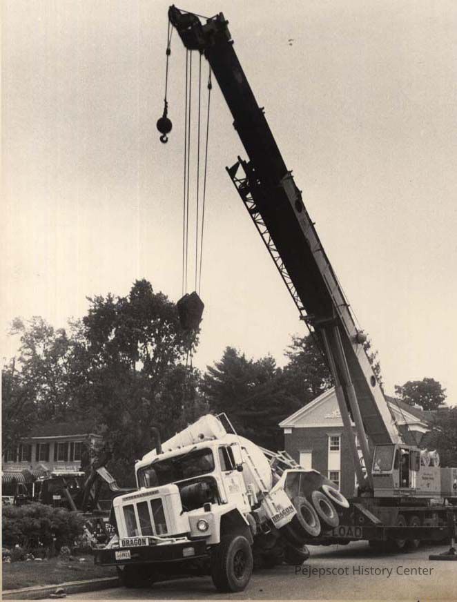 A B/W photographic view of a crane setting the cement truck up right. They are in front of the Pilgrim House.