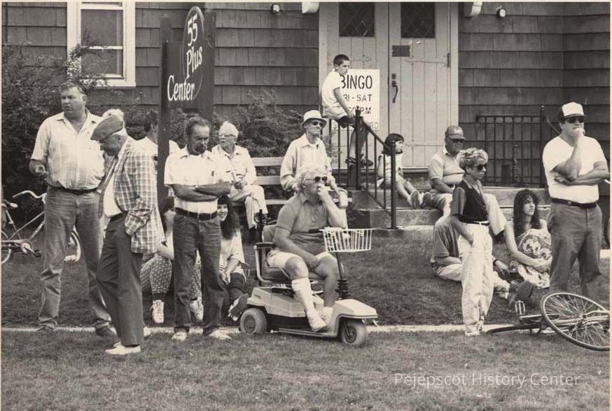 A B/W photographic view of a crowd in front of the 55 Plus Center. Marked on the front, "Crowds gather to watch the cement truck being up righted".