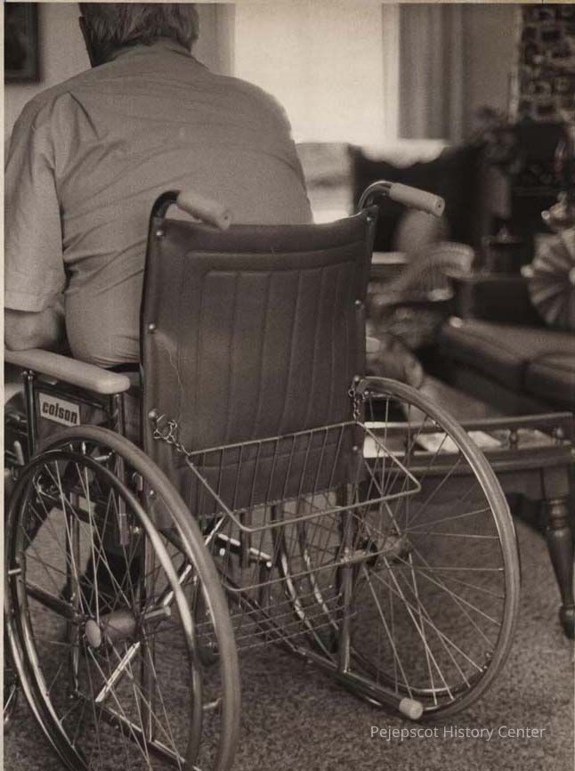 A B/W photographic view of a devise invented by Herbert A. Merrill Jr.. By attaching a bicycle basket to the back of a wheelchair handicap people can carry stuff.