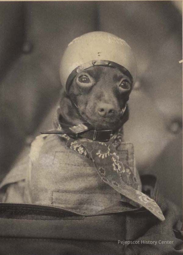 A B/W photographic view of a dog dressed in clothes. Marked on back, "Biker Dog Dolly". This photo was published 2/11/1992