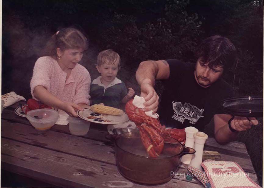 A color photographic view of a family having a lobster cookout. This photo was published 8/8/1988.