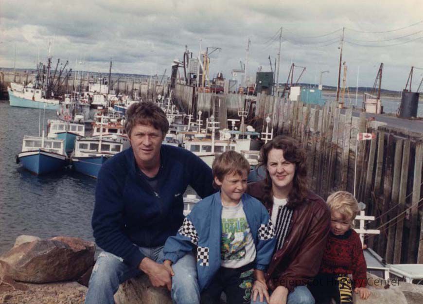 A color photographic view of a family sitting by the ocean with a lot of boats behind them. This photo was published 10/11/1990.