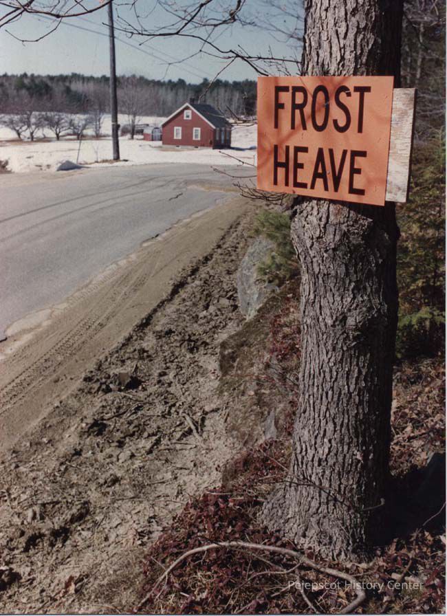 A photo view of a "Frost Heave" sign. 3/7/1990.