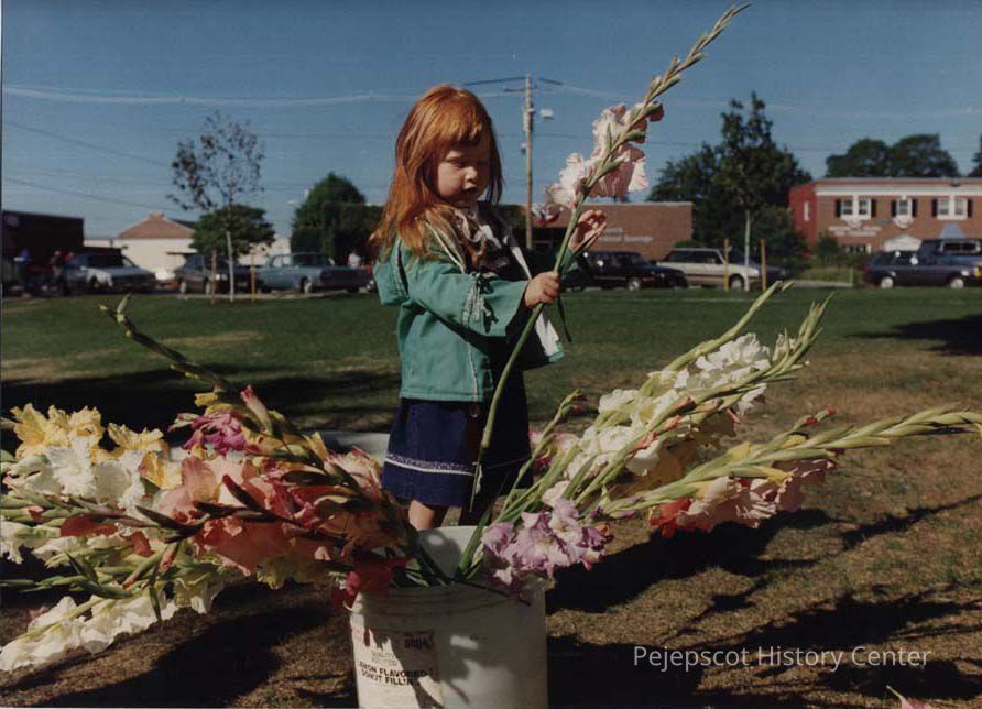 A color photographic view of a girl and some flowers at the farmers market on the Mall. This photo was published 9/14/1989.