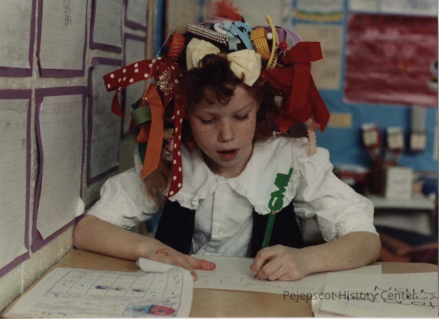 A photo view of a girl with an artistic hairdo. 2/12/1990.