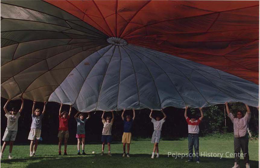 A color photographic view of a group of children and a teacher holding ?. This photo was published 6/22/1987.