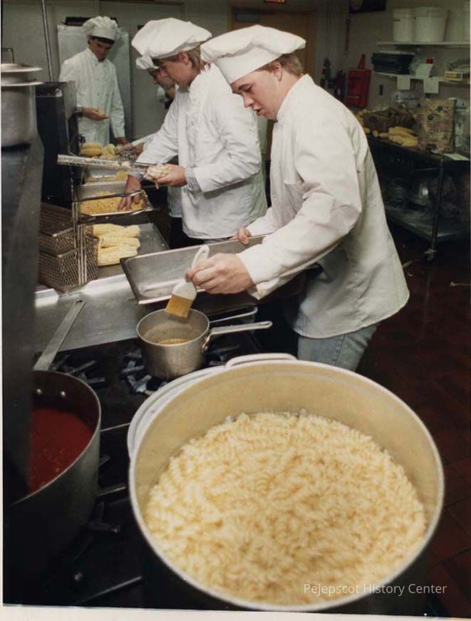 A color photographic view of a group of cooks preparing dinner. This photo was published 9/18/1991.