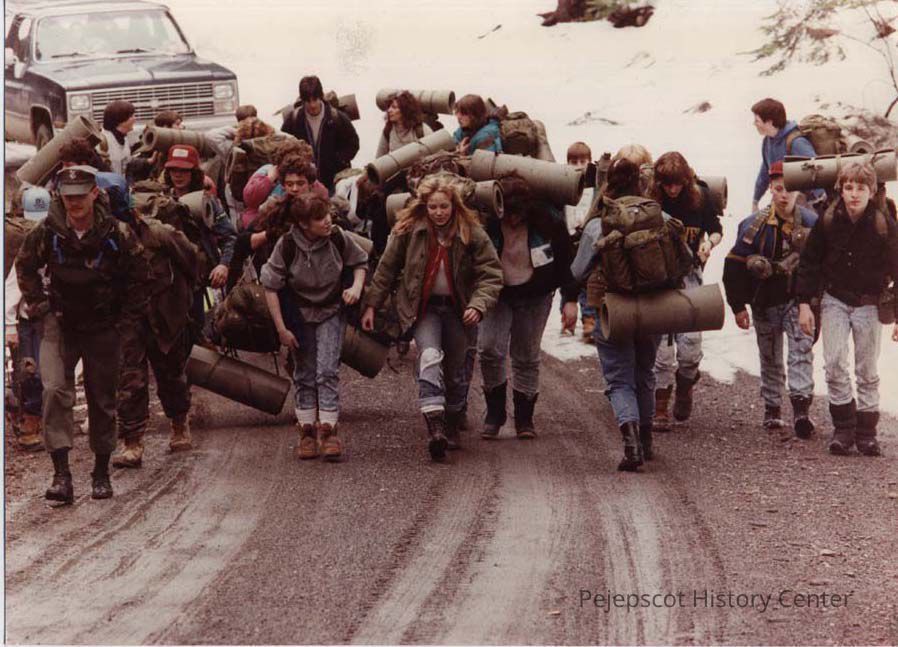 A color photographic view of a group of hikers starting out. This photo was published 4/24/1990.