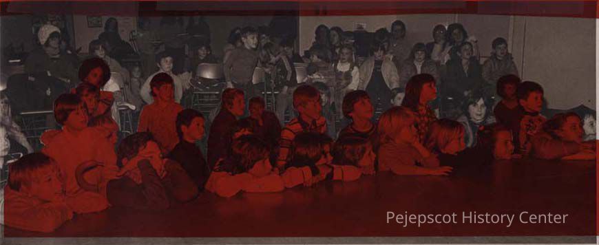 A photo view of a group of kids watching Clown Al. 1/29/1980
