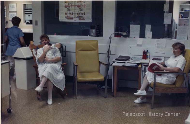 A color photographic view of a group of nurses. One of them is holdings very small baby. This photo was published 11/2/1990.