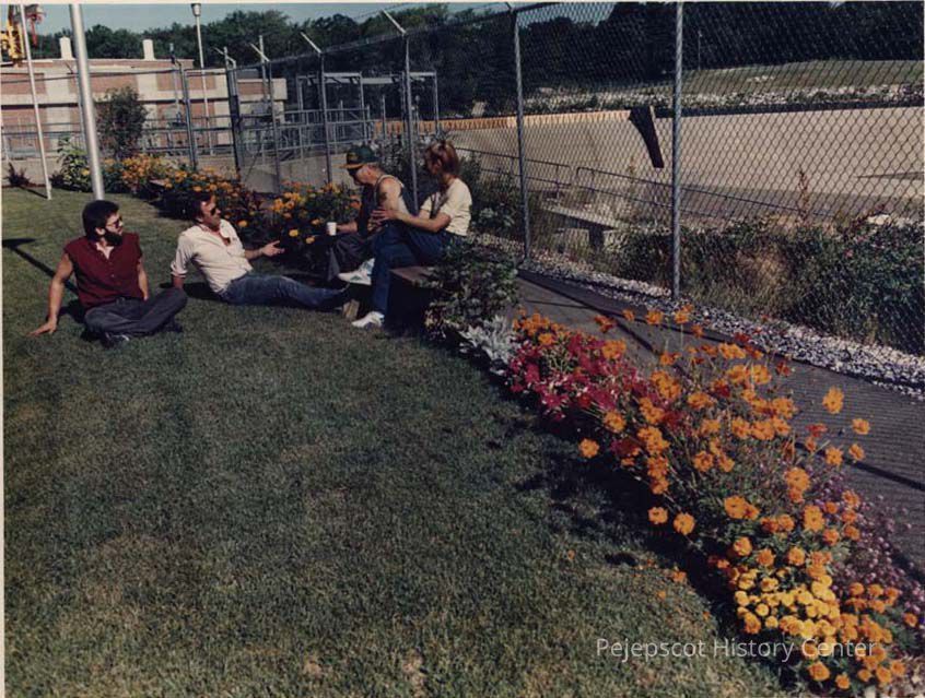 A color photographic view of a group of people sitting amongst some flowers near the fish ladder. This photo was published 7/15/1988.