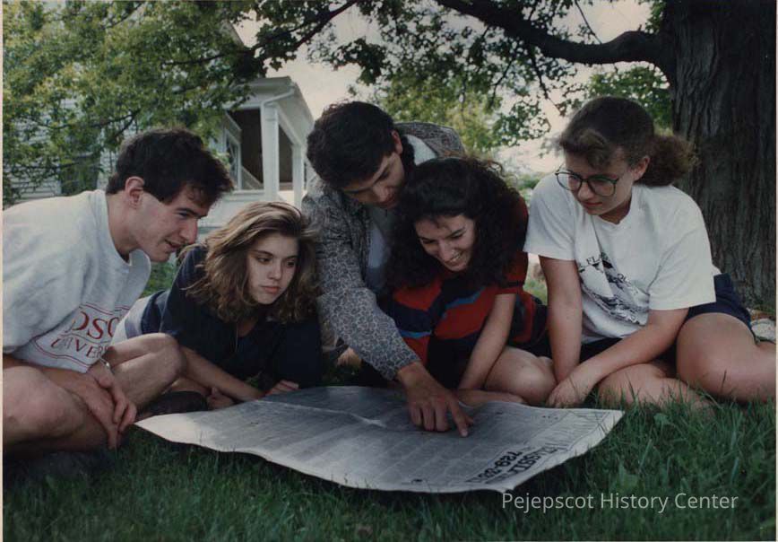 A B/W photographic view of a group of young people looking at a newspaper. They are (l to r) Keith Lardie, Ruth Thombs, Ray Maestas, Cathy Lardie and Jenn Groleau.