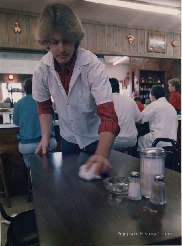 A color photographic view of a guy cleaning a table in a restaurant. This photo was published 2/6/1989.