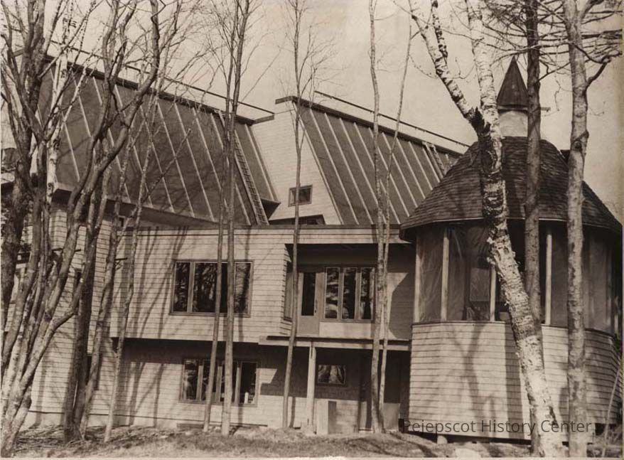 A B/W photographic view of a three story Victorian looking home on Orr's Island built by Robert Multer for maximum energy efficiency, utilizing solar heat.