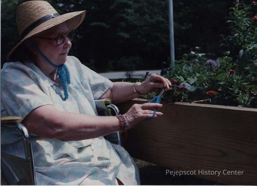 A color photographic view of a lady in a wheelchair pruning Bonsai plants. This photo was published 8/15/1989.
