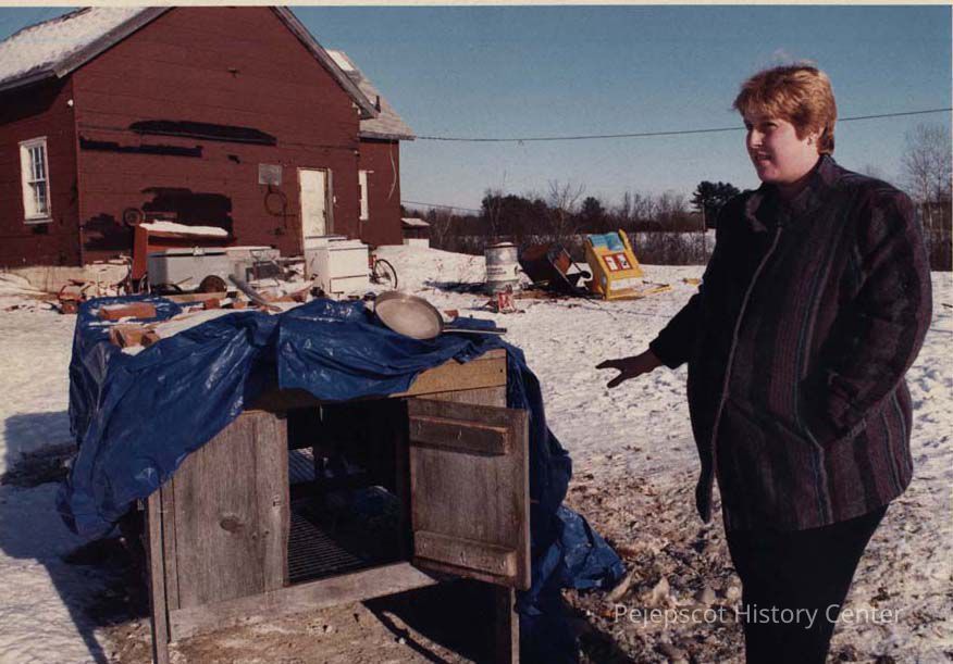 A photo view of a lady showing an animal cage. 12/13/1989.