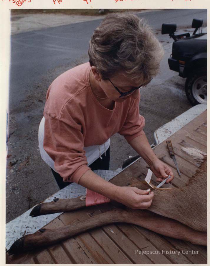 A color photographic view of a lady tagging a deer. A requirement for all deer shot in Maine. This photo was published 11/4/1991.