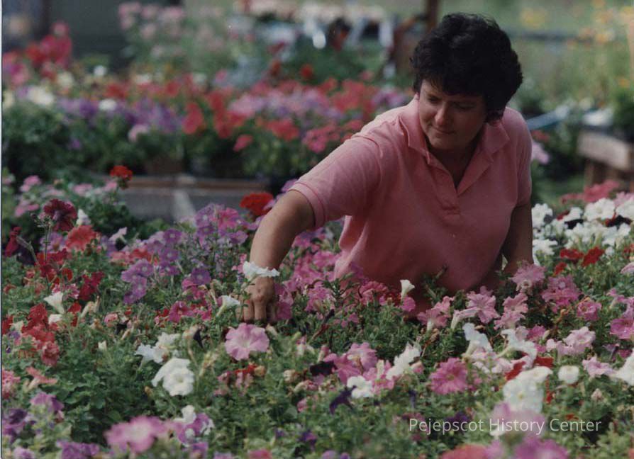 A color photographic view of a lady working in a flower bed. This photo was published 8/17/1989.