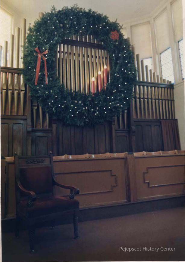 A photo view of a large Christmas wreath on an organ. 12/23/1988.