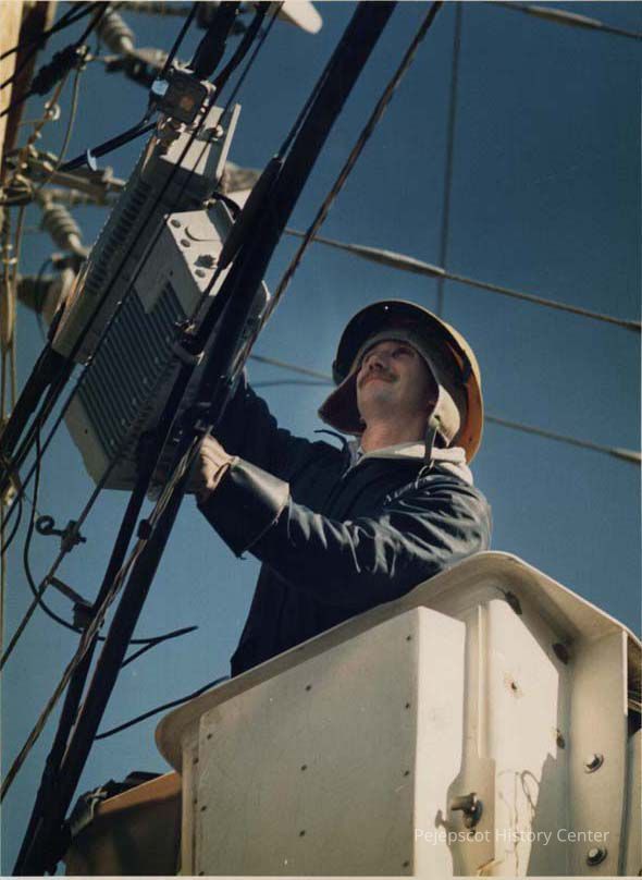 A color photographic view of a lineman working on some wires. This photo was published 2/14/1991.