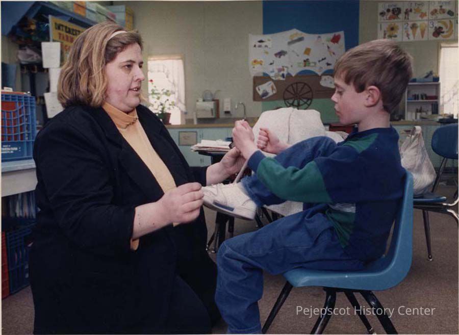 A photo view of a little boy getting help tying his shoe lace. 12/10/1991.