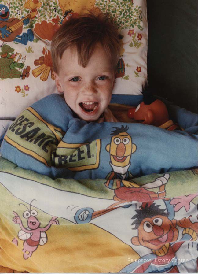 A color photographic view of a little boy in bed. The bed clothing has cartoon characters printed on them. This photo was published 7/10/1989.