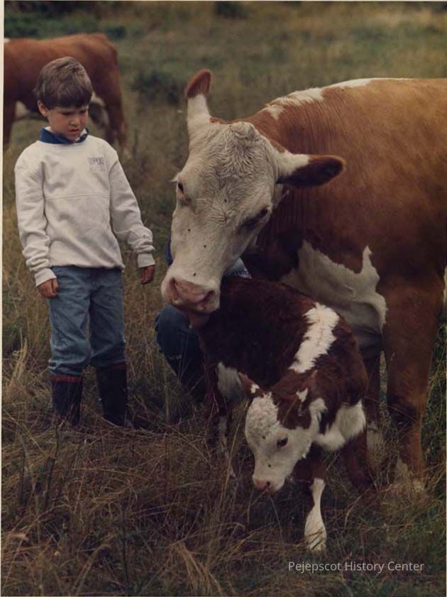 A color photographic view of a little boy watching a mother cow and her calf.. This photo was published 7/26/1988.