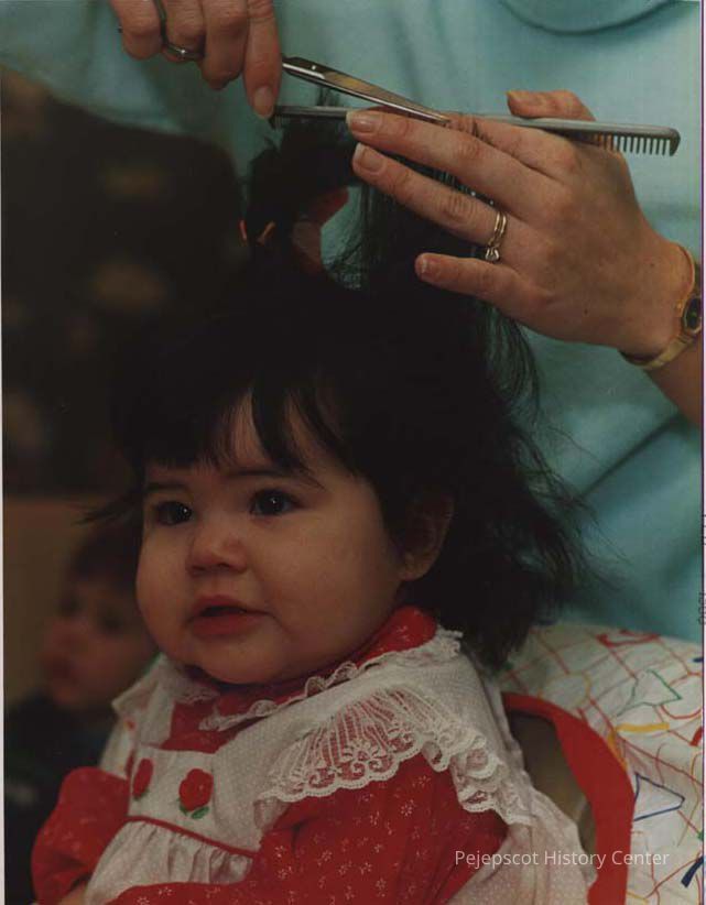 A color photographic view of a little girl getting her hair cut. This photo was published 2/4/1988.