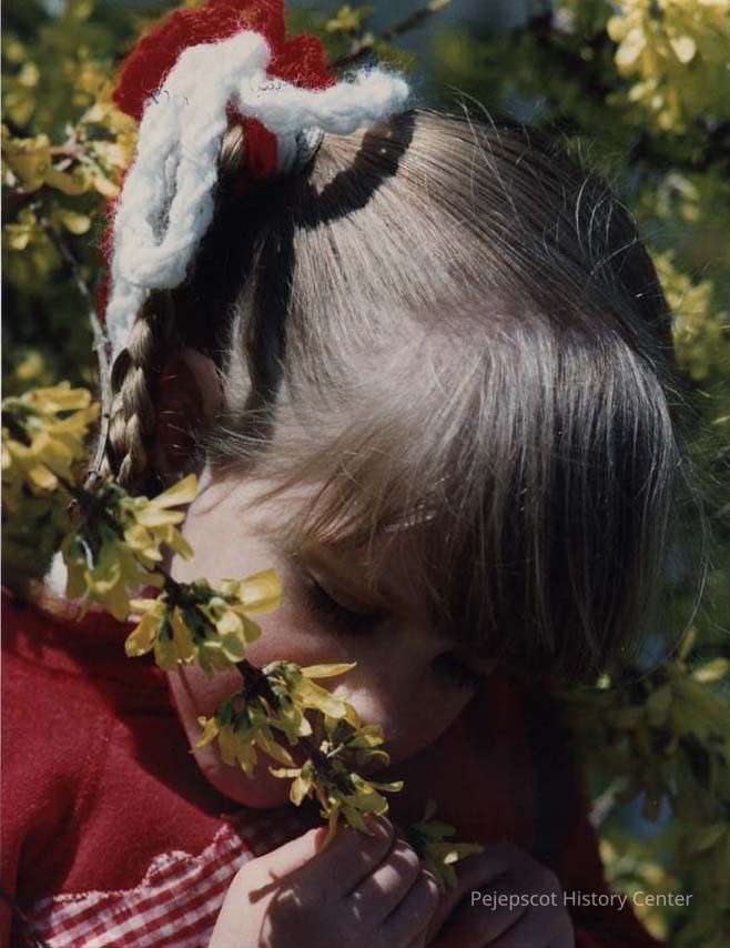 A color photographic view of a little girl smelling some flowers. This photo was published 5/11/1989.