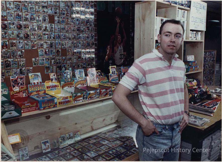A photo view of a man and a display of baseball cards. 3/21/1990.
