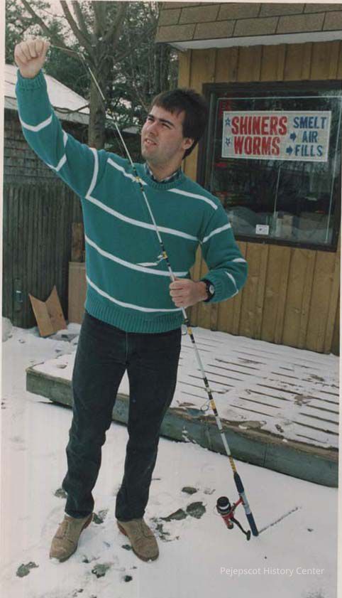 A photo view of a man and his fishing rod. 3/18/1987.