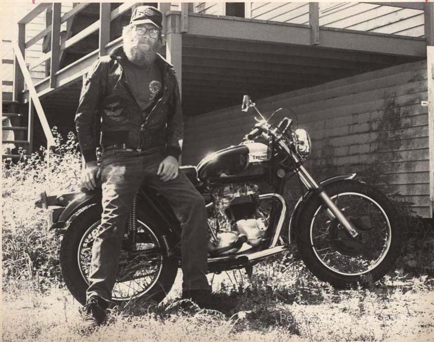 A B/W photographic view of a man and his motorcycle. a man and his motorcycle. This photo was published 8/24/1992.