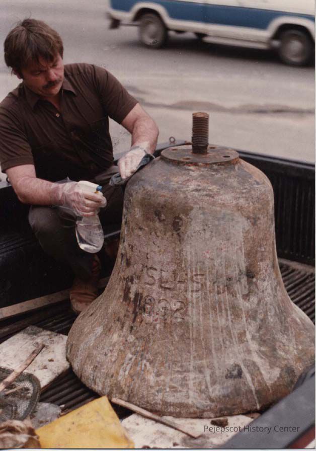A color photographic view of a man cleaning a bell shaped object. Perhaps it came from the ocean. This photo was published 5/16/1988.