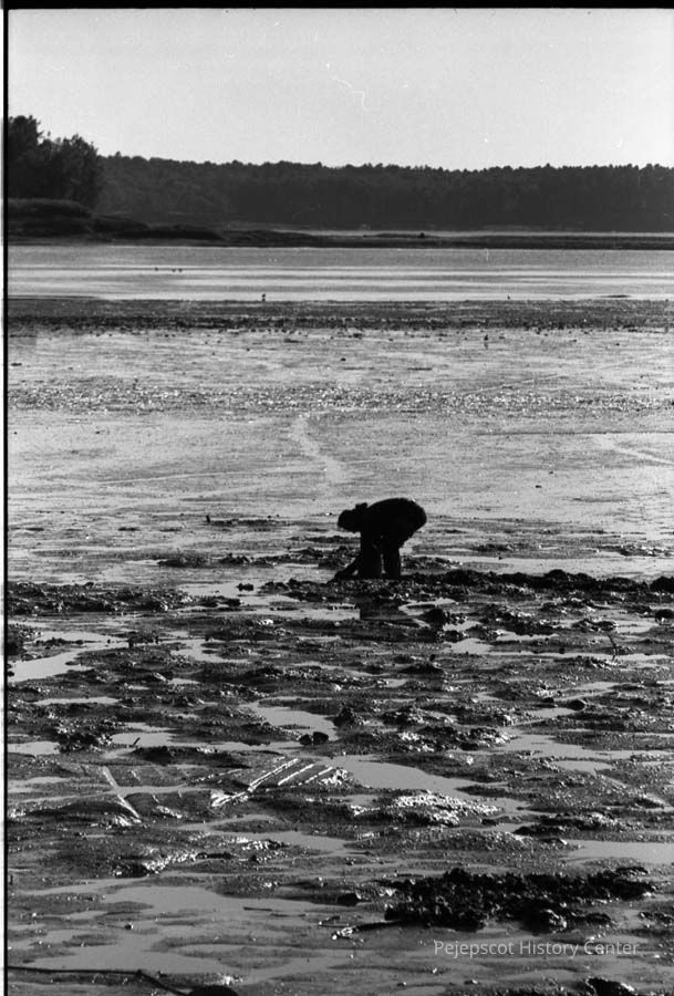 A B/W photographic view of a man digging clams in Middle Bay..