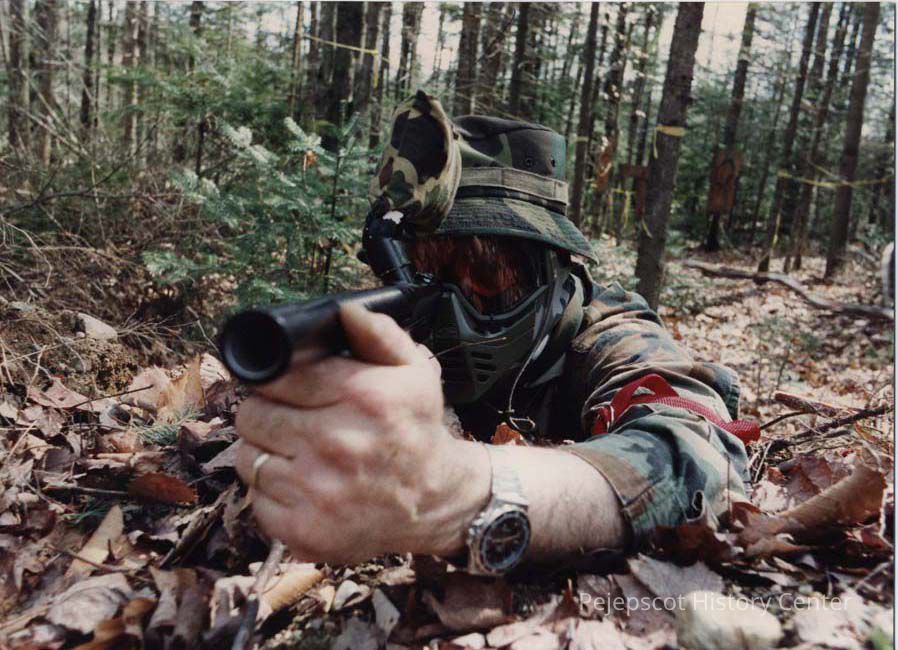 A photo view of a man playing soldier with a paint ball gun. 5/10/1989.