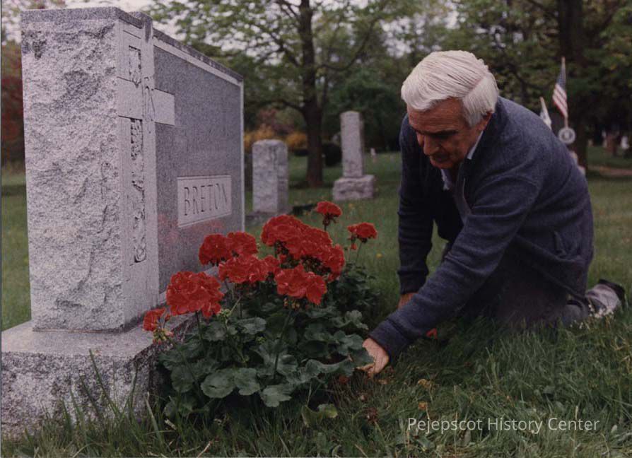 A photo view of a man putting flowers on a grave. 5/26/1989.