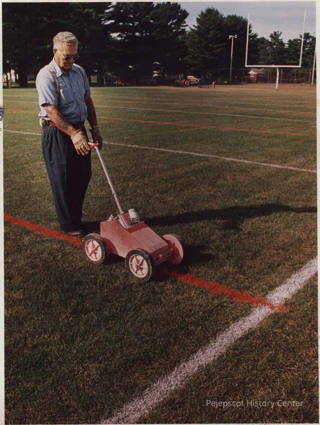 A photo view of a man putting lines on a playing field. 8/28/1987.