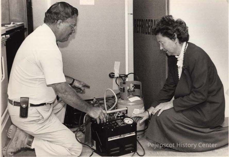 A photo view of a man removing refrigerent from an old refrigerator. 8/24/1992.