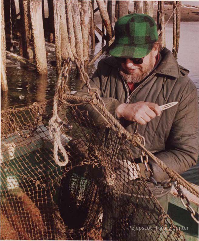 A color photographic view of a man repairing a fishing net. Marked on the front. "Bailey Is." This photo was published 3/10/1987.