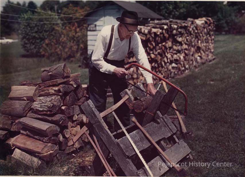 A photo view of a man sawing firewood. 8/3/1988.