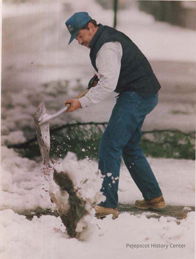 A photo view of a man shoveling muddy snow. 4/29/1987.