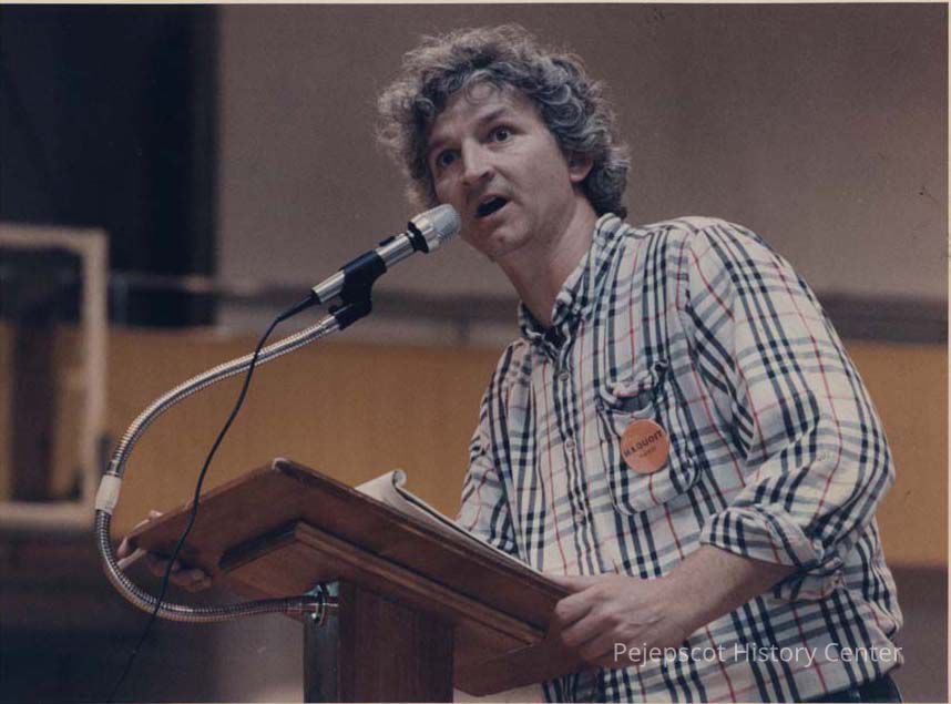A color photographic view of a man speaking. He is wearing a "Maquoit Again" button This photo was published 5/27/1992.