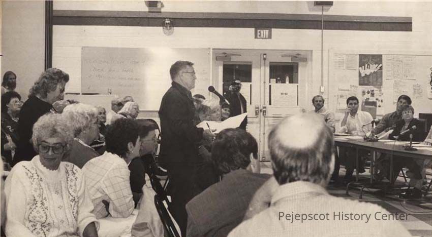 A B/W photographic view of a man speaking to a board. This photo was published 8/10/1992.