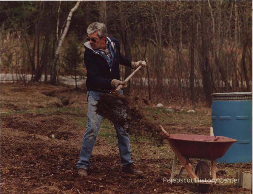 A color photographic view of a man spreading compost on a garden. This photo was published 4/29/1988.