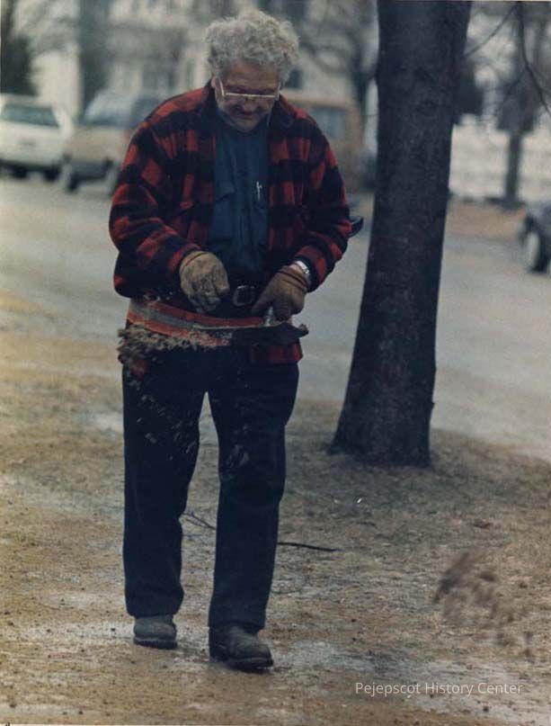 A color photographic view of a man spreading grass seed. This photo was published 1/11/1989.