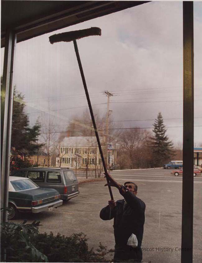A color photographic view of a man washing windows at the laundromat at the corner of Stanwood and Pleasant Street.
