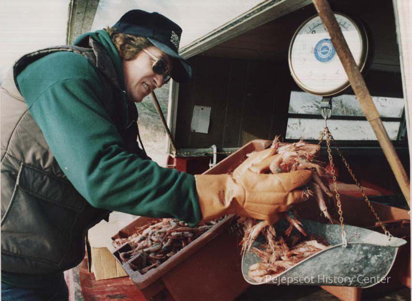 A photo view of a man weighing shrimp. 12/17/1986