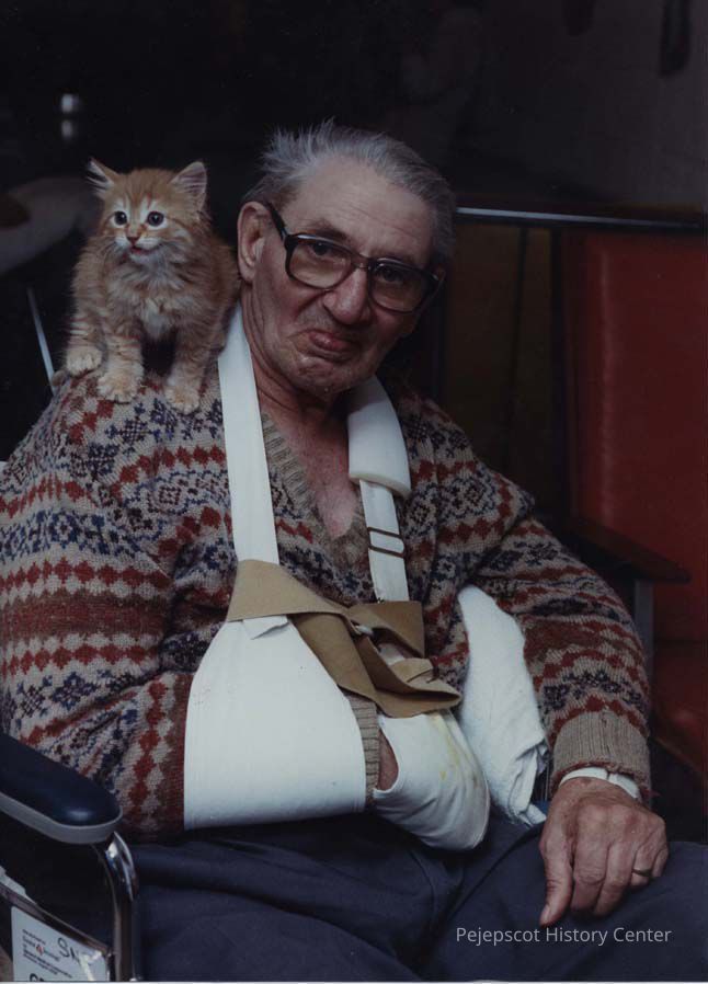A color photographic view of a man with a kitten on his shoulder. He has one arm in a sling. This photo was published 11/01/1989.