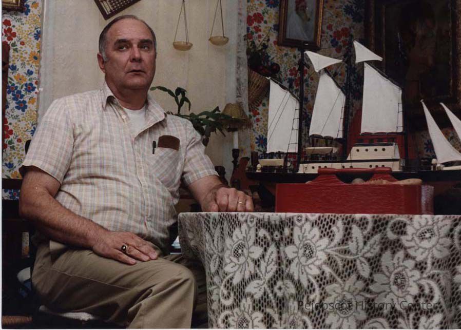 A color photographic view of a man with a ship model. This photo was published 6/19/1989.